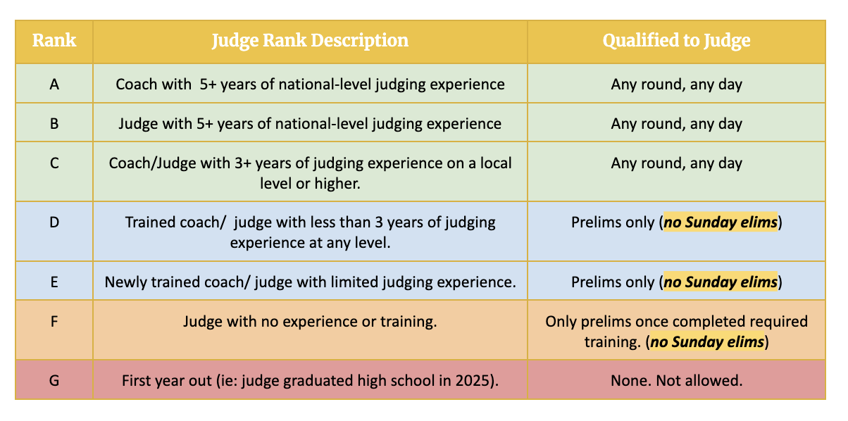 We’re asking coaches to provide a bit of background on their judges and rate them based on experience when registering. This helps our tab staff place judges more effectively. This includes coaches giving us a judge ranking from the scale below, but we also ask that you include some written notes about your judges (this doesn’t need to be super detailed, just enough to give us a sense of who’s judging and how we can best use them).
